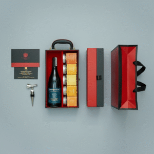 The “Premium Luxury Wine” corporate gift set draws inspiration from international wine-advertising aesthetics – where deep black backdrops meet cinematic reds and subtle golden shimmer, elevating the bottle silhouette, glass textures, and refined craftsmanship with timeless luxury.